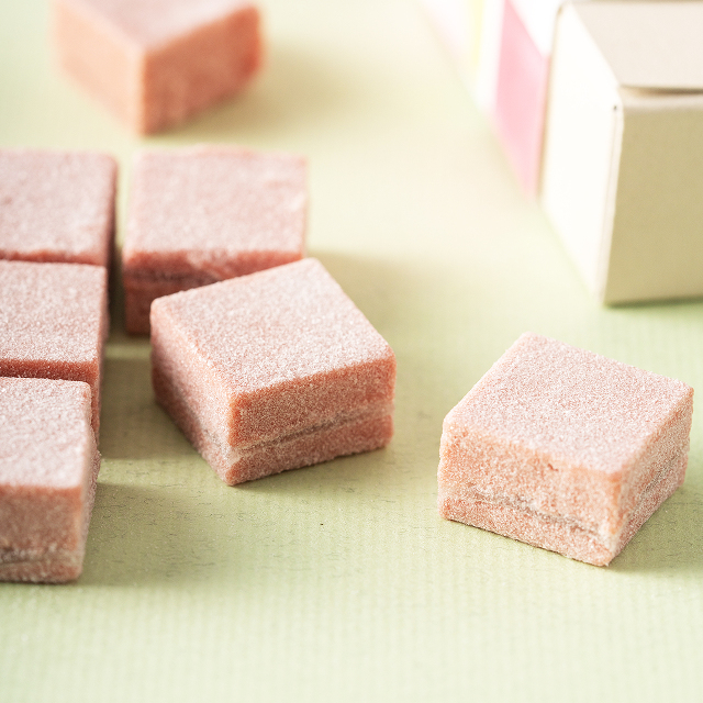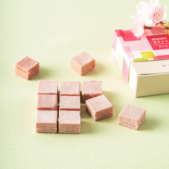 ホワイトチョコレートをベースに、桜の花や葉、苺のピューレやパウダーを加え、 糀甘酒でまろやかな甘みに仕立てたフルーティなガナッシュで求肥をサンド。