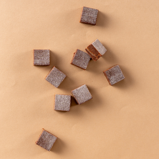 カカオ感のしっかりとしたガーナ産カカオ66%のショコラと、フルーティで華やかな香りのエクアドル産カカオ39%のショコラをブレンドし、糀甘酒を加えてまろやかな甘みを引き出したガナッシュで求肥をサンド。 モチモチ食感となめらかな口どけの和の生チョコレート。