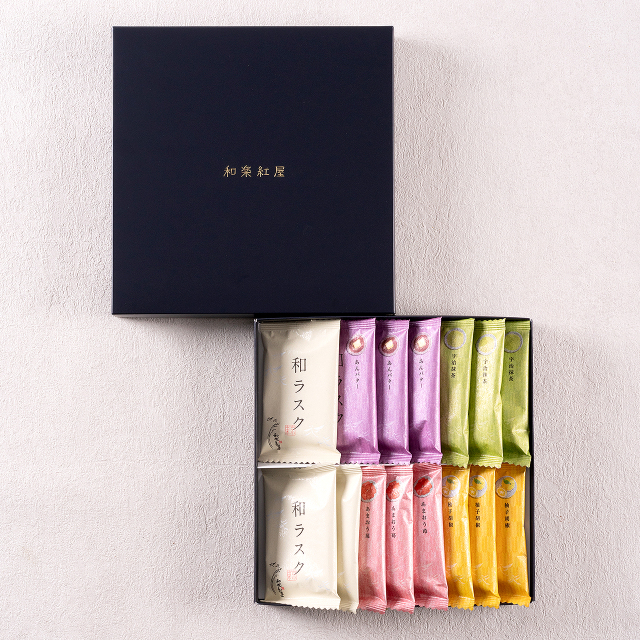 上品な甘さの和三盆糖や北海道産発酵バターを使用した定番人気の和ラスクと、北海道産の粒餡の風味豊かな「あんバター」、フルーティーな味わいの「あまおう苺」、香り良くほろ苦い「宇治抹茶」、爽やかな辛味の「柚子胡椒」を詰合せました。