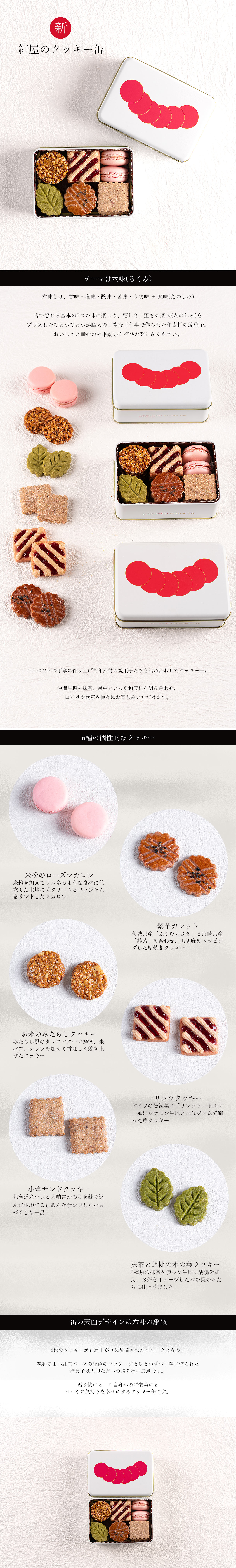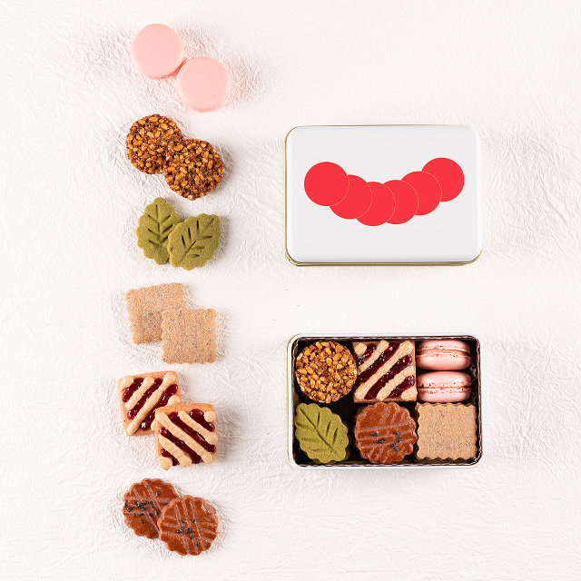 舌で感じる5つの味に「楽しみ」をプラスした「六味」をコンセプトに、ひとつひとつ丁寧に作り上げた和素材の焼菓子たちを詰め合わせたクッキー缶。 沖縄黒糖や小豆、米粉といった和素材と、国産フルーツやお茶、スパイスなどを組み合わせ、口どけや食感も様々にお楽しみ頂けます。