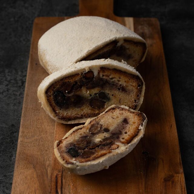 発酵バターを贅沢に使った風味豊かな生地で、北海道産小豆入りのアーモンドクリームと、麹甘酒と洋酒に漬け込んだ伊予柑ピールや大納言・金時豆・栗の甘納豆をたっぷり包みました。優しい甘さの和三盆糖で仕上げた和のシュトーレン。