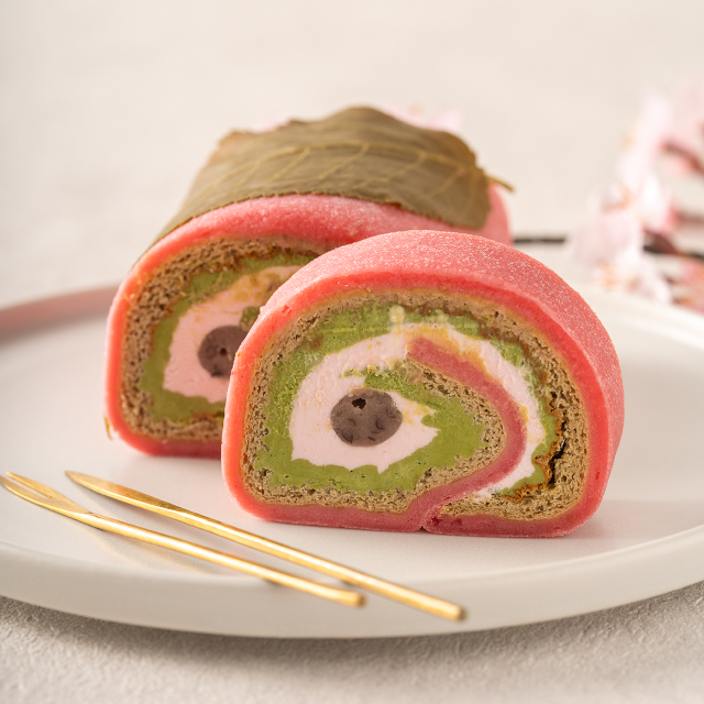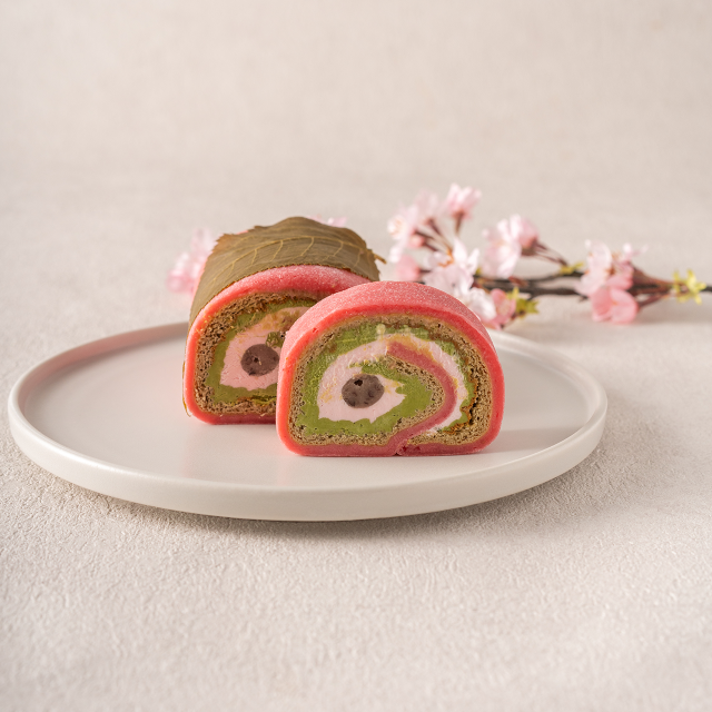 小麦粉不使用の米粉生地で、抹茶カスタード、桜の生クリーム、北海道小豆と桜餅餡をたっぷり巻き込み、桜シロップと苺パウダー入りの求肥でくるりと包みました。